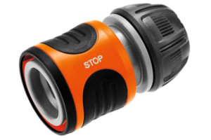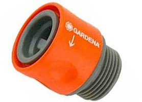 Kunststof, oranje/grijs. Snelle aansluiting voor enerzijds een koppeling en anderzijds een wasmachine. Overgangs-slangstuk, door draaibeweging los te koppelen. Met buitendraad en schuifsysteem.
