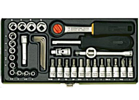 Handgereedschapset in stevige koffer. Deze set bestaat onder andere uit diverse ratels, schroevendraaiers, ringsteeksleutels, een inbussleutelset en diverse extensies en adapters. Verder nog een 120-delige schroefbitset en een 31-delige doppenset.