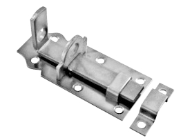 Hangslotschuif. Zwaar model. Rechthoekige grondplaat en sluitbeugel, beide voorzien van verzonken schroefgaten. Vlakke schoot met omzetting voor sluiting en vastzetting door hangslot