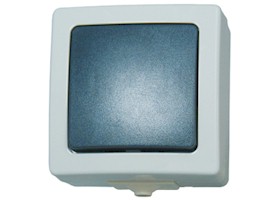 Spatwaterdichte wissel wipschakelaar met enkele wip. Slagvaste behuizing. Aansluiting 10 Ampère, 250 Volt. Beschermingsklasse IP44, d.w.z. spatwaterdichte uitvoering, waardoor geschikt voor toepassing buiten. Kema-Keur.